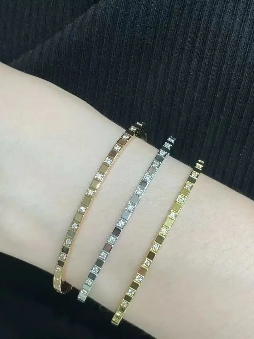 Stylish gold-filled iced bangle with premium shine. Adjustable 16–17cm fit. Everyday luxury with certified quality.