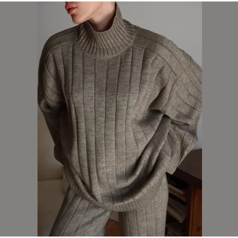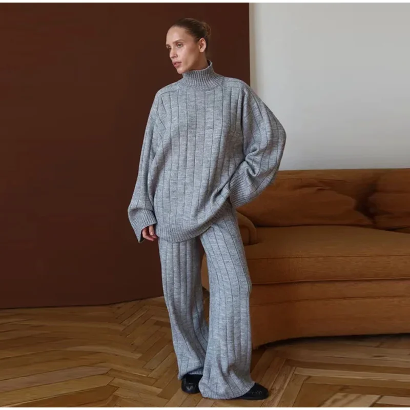 A premium two-piece ribbed knit set featuring a soft high-waist pant and a cozy full-length sweater. Minimal, elegant, and perfect for autumn/winter styling. Designed for comfort with a refined, luxury look.